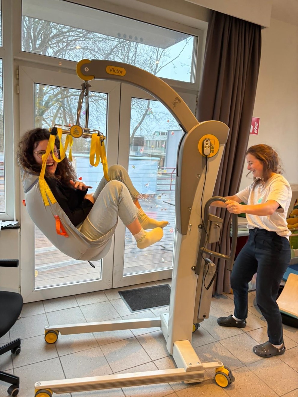 Bij team Flori werd recent een nieuwe tillift in gebruik genomen via een leasingcontract. Deze lift zorgt ervoor dat het tillen en verplaatsen van de kinderen op een veilige en ergonomische manier kan verlopen, zowel voor de kinderen als voor de begeleiders. Het team testte de tillift natuurlijk eerst zelf uit!