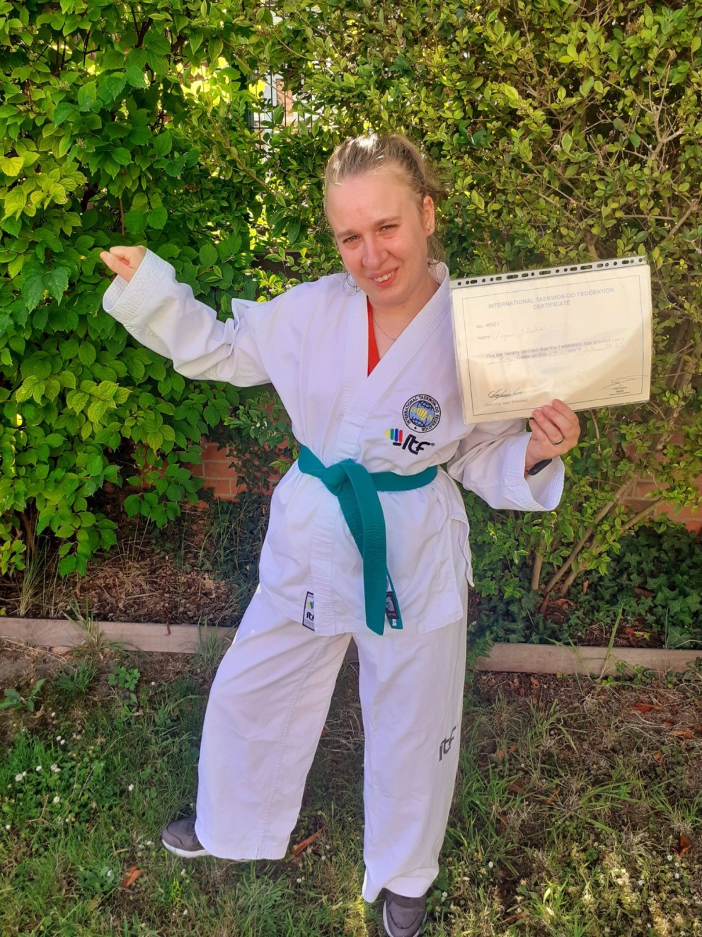 Elle a trouvé l'examen assez excitant, mais elle a persévéré et a été récompensée par un diplôme de la Fédération internationale de Taekwon-Do. Elodie nous a fait savoir qu'elle était très heureuse et fière de sa réussite - et nous aussi, bien sûr ! 🥋💚
